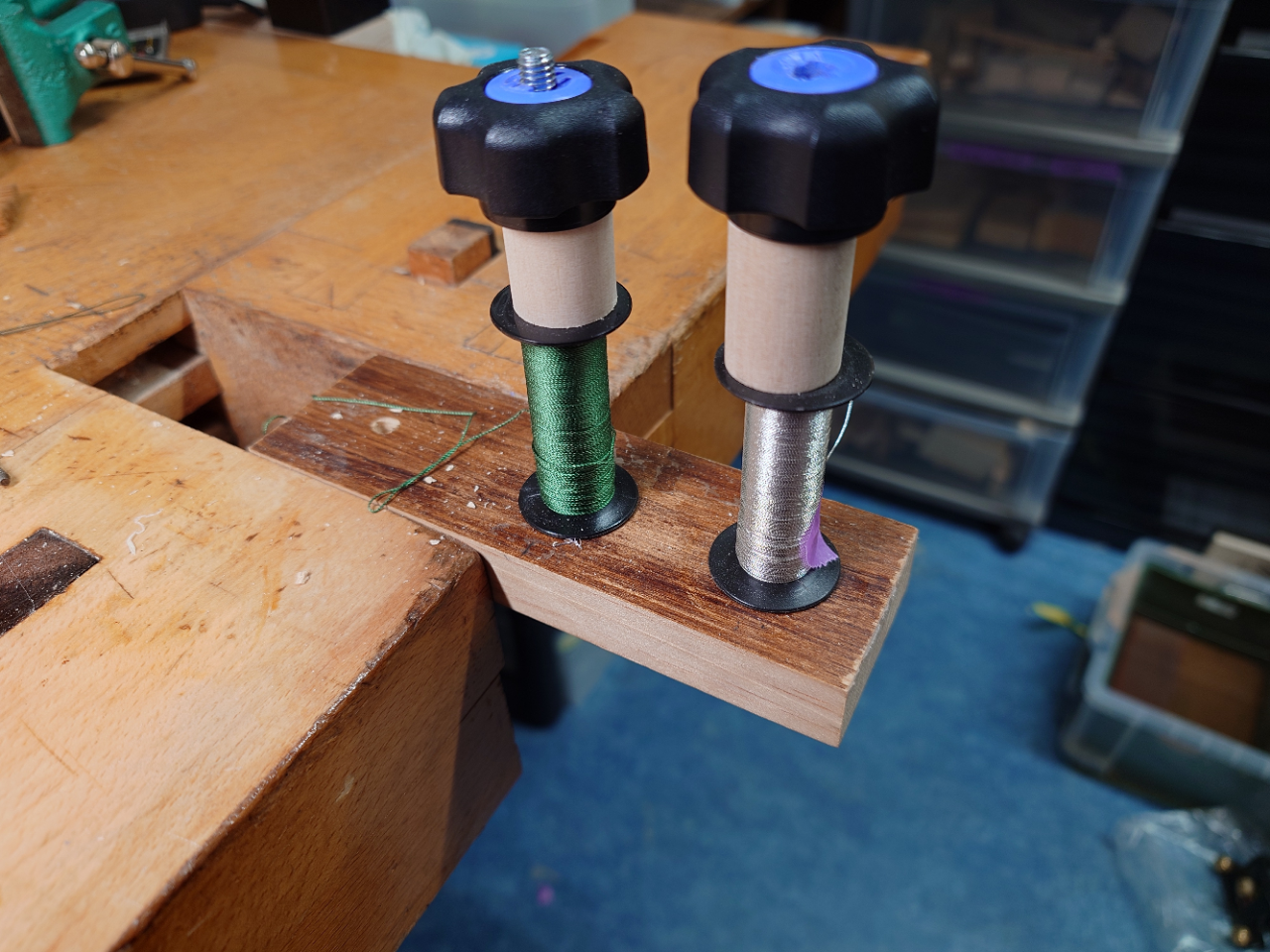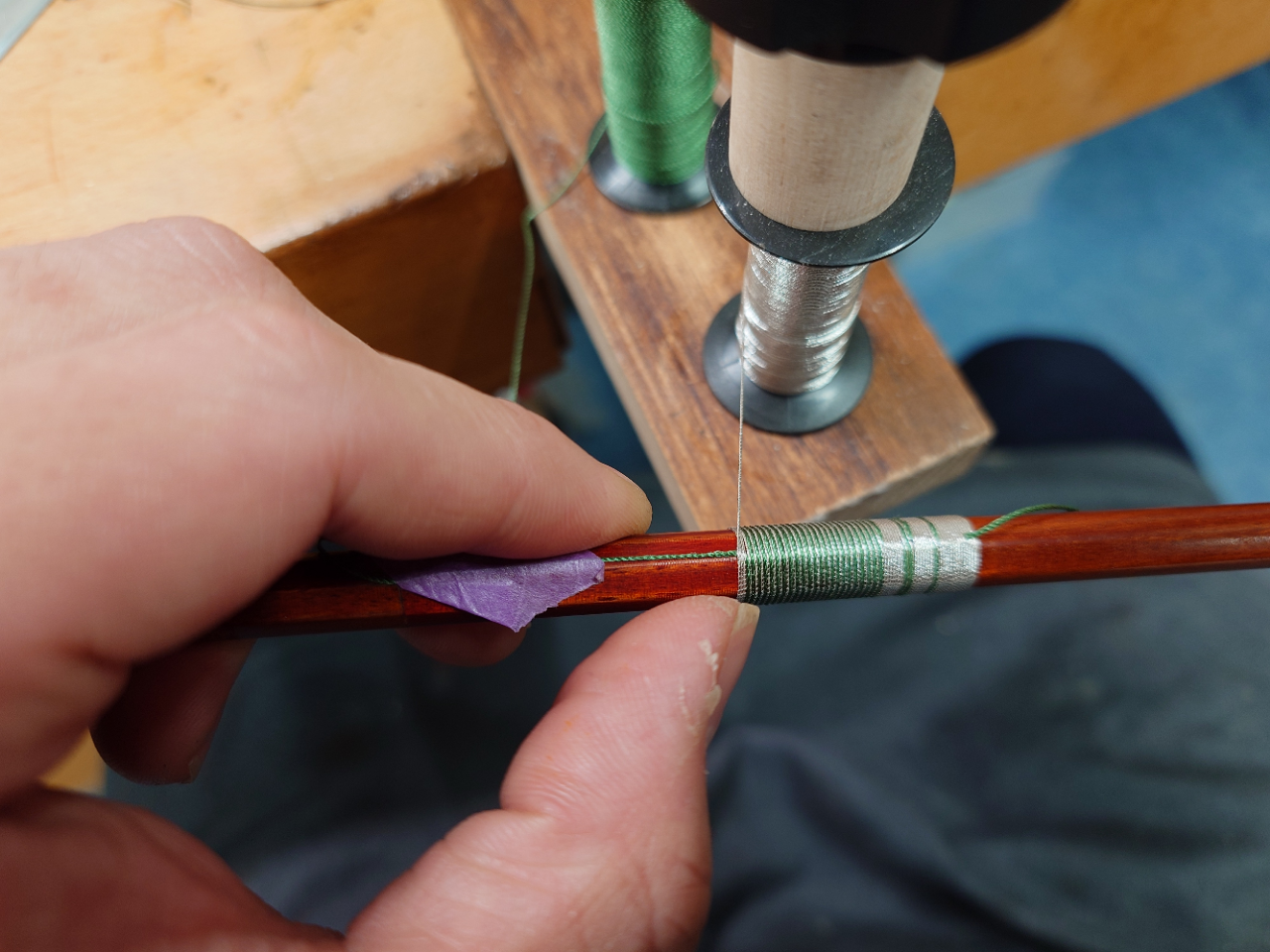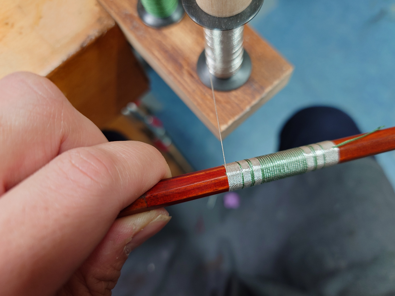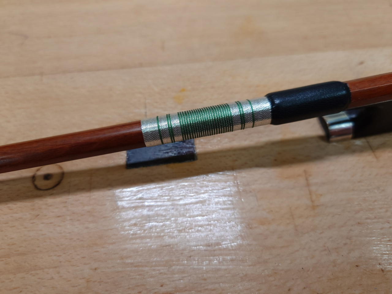 技術日記㉔ in 札幌 2025/04/24 みなさまこんにちは🌞 札幌店から、最近の作業紹介が送られてきました! どうぞお楽しみください♪ 弓の飾りラッピング 工房内で中古弓のセットアップ時に飾りラッピングで巻きなおしたので、ご紹介します。 ラッピングというのは、右手の人差し指の当たる位置に巻いてある銀線のことです。銀線が巻いてある通常のラッピングとは異なり、飾りラッピングは銀糸と絹糸を同時に巻くことで様々な模様を施すことができます。 【作業風景】 2色の糸巻きを固定して、糸をまっすぐ張りながら作業をしていきます。 糸を巻く前にどういった模様にするか決め、採寸をしてから巻き始めます。 2色を同時に巻いたり、片方のみ巻いたり、と変化をつけることで模様を作っていきます。 【完成】 糸を巻き終わった後、革を巻いて完成です。 弓の重量バランスが変化するので、すべての弓に施すのが適切ではないですが、交換する事で印象が大分変わりました。 技術日記